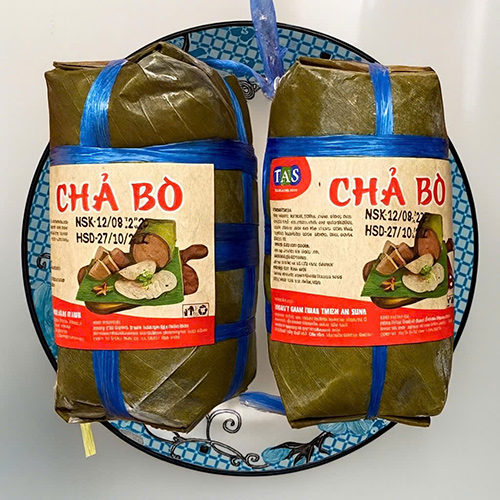Chả bò ngon, chất lượng, được gói bằng lá chuối, hàng nóng, tươi mới mỗi ngày.